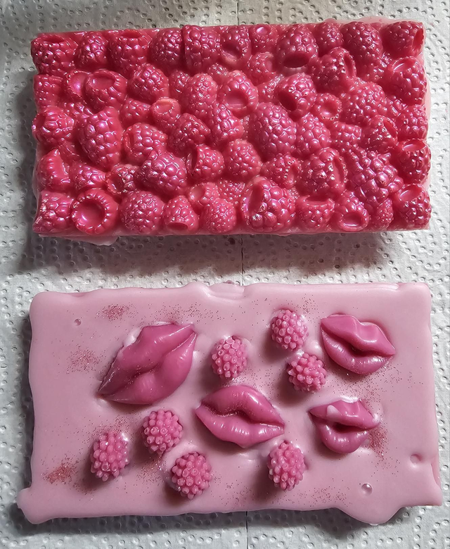 Diese besondere Tafel - Achtung, nicht zum Verzehr geeignet! - wird in mehreren Schichten aus reinem Sojawachs unter Zugabe von hochwertigen Duftölen sowie Farbpigmenten gefertigt. Auf der Vorderseite reihen sich reife Himbeeren aneinander und auf der Rückseite werden diese sozusagen geküsst. Passend zum Namen des Duftes. Einfach ein Stück von der Tafel abbrechen und in die obere Schale einer Duftlampe geben, Teelicht drunter und genießen. Dieser fruchtige Duft erfreut zu jeder Jahreszeit. Hergestellt aus natürlichem, veganen Sojawachs und hochwertigen Duftölen.